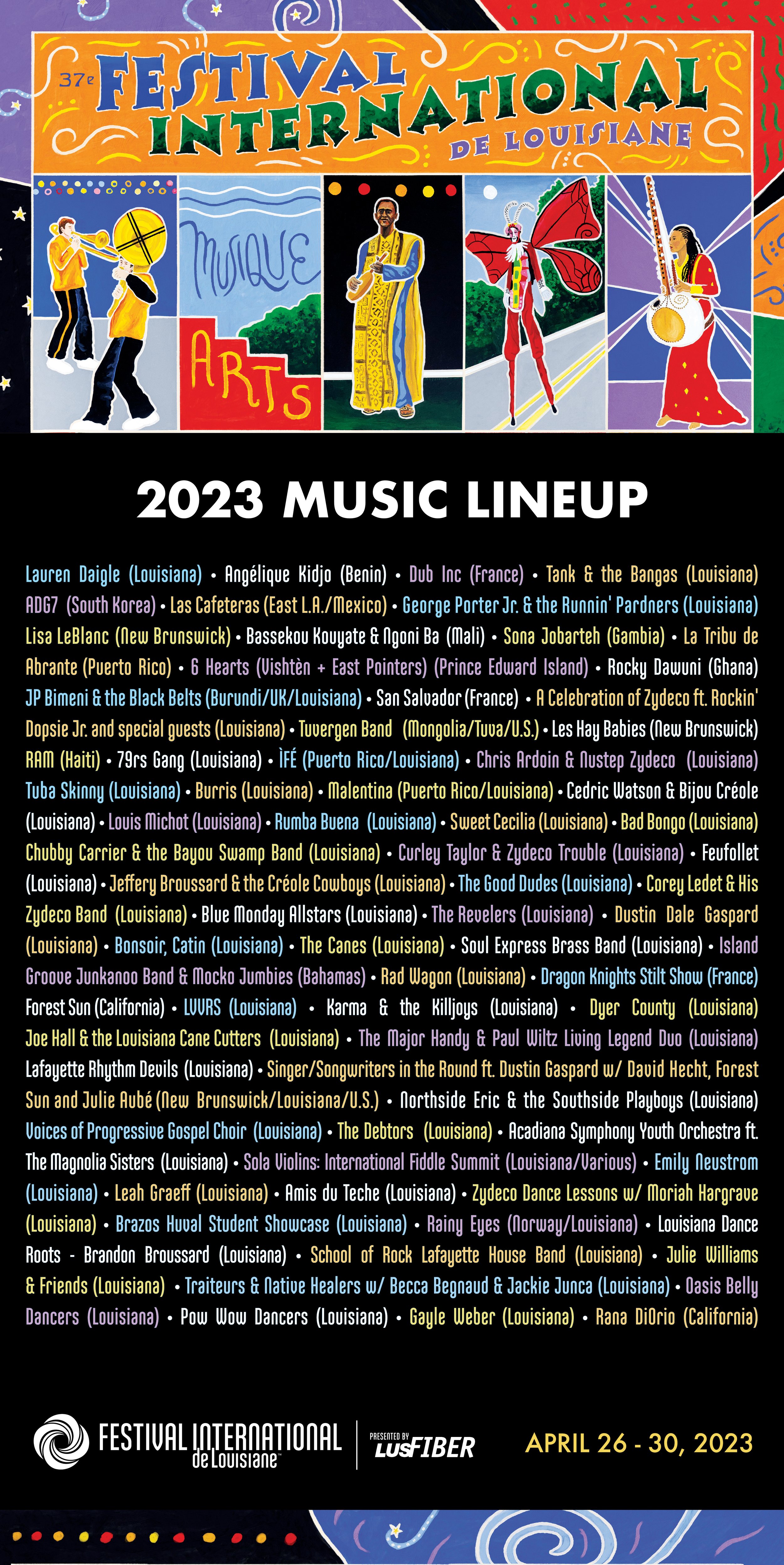 Festival International 2025 Dates Festival International de Louisiane | April: Headlining this yearโs eclectic lineup features Grammy award winning Oumou Sangarรฉ of Mali, Five Alarm Funk of Vancouver, Canada and the explosive Hip Hop collective Nomadic Massive to close out the . Festival International de Louisiane is fast approaching; A lineup and artwork reveal party was held at Warehouse 535 in Lafayette; .